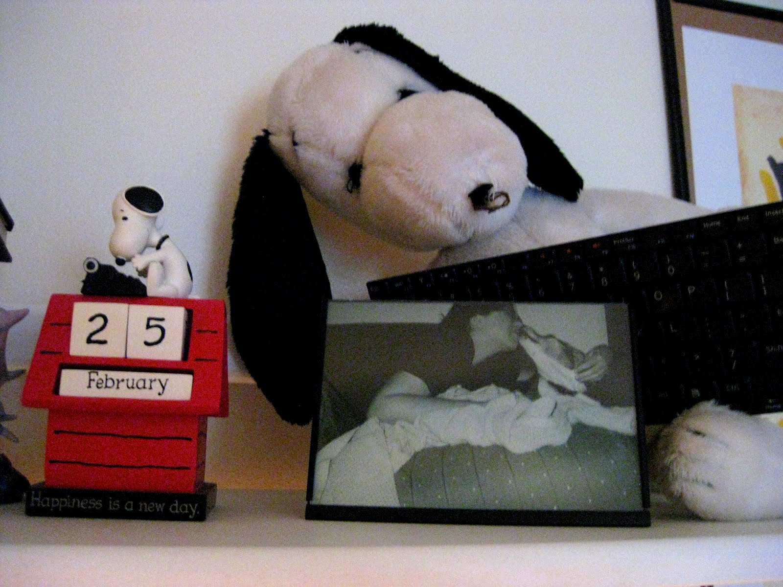 [Snoopy stuffed animal from my childhood; photo of my old dog Sadie Beagle and I circa 2004; Snoopy desk calendar from Hallmark]